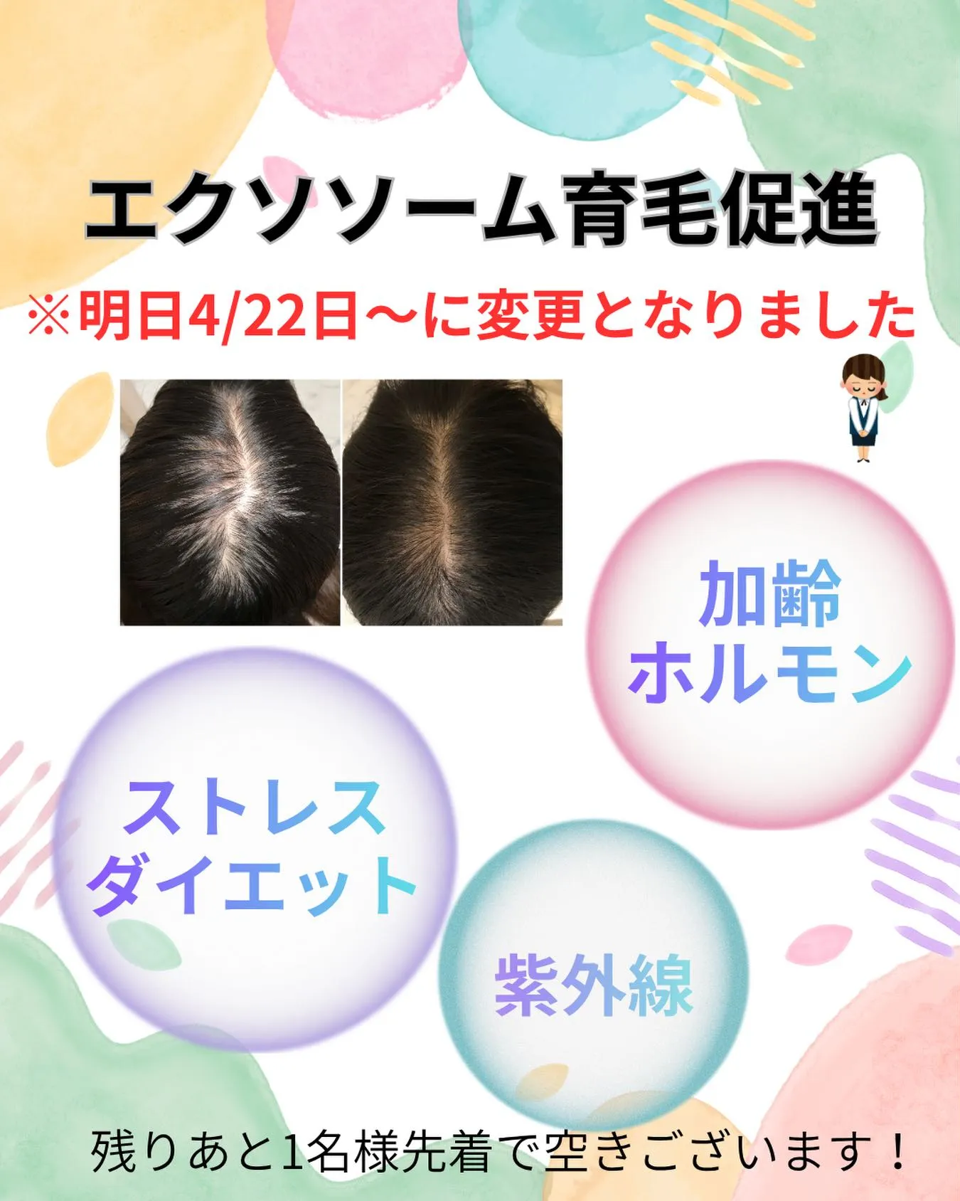 お知らせ 2026/04/21 お知らせ 4月のエクソソーム施術日が 4/23〜4/30 → 4/22〜4/29に変更となりました。 先着で残り1名様空きがございます。 気になる方はぜひご予約お待ちしております🌸 #千葉エステ #エクソソーム #女性の薄毛 #肌質改善 #ハイパーナイフ千葉
